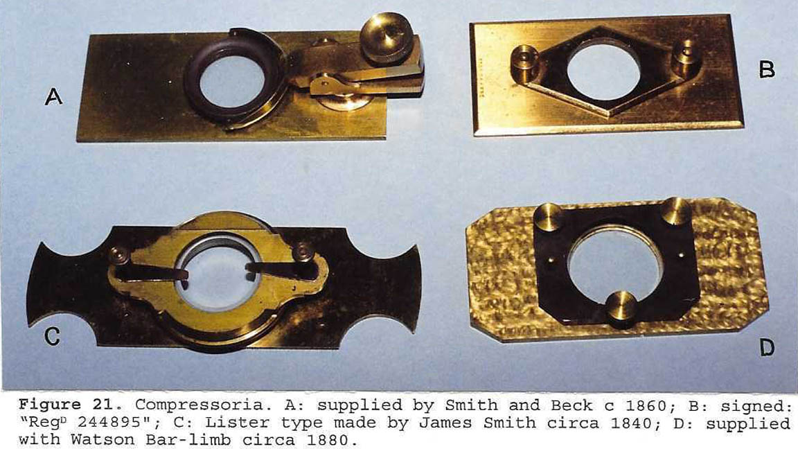 . This device, registered on a fixed corner rest on the stage, has a grid, which under the microscope could be used to reposition the stage to a specific point on a slide previously noted at that location on the grid. The most common type was Maltwood's Finder(Fig.14, bottom).