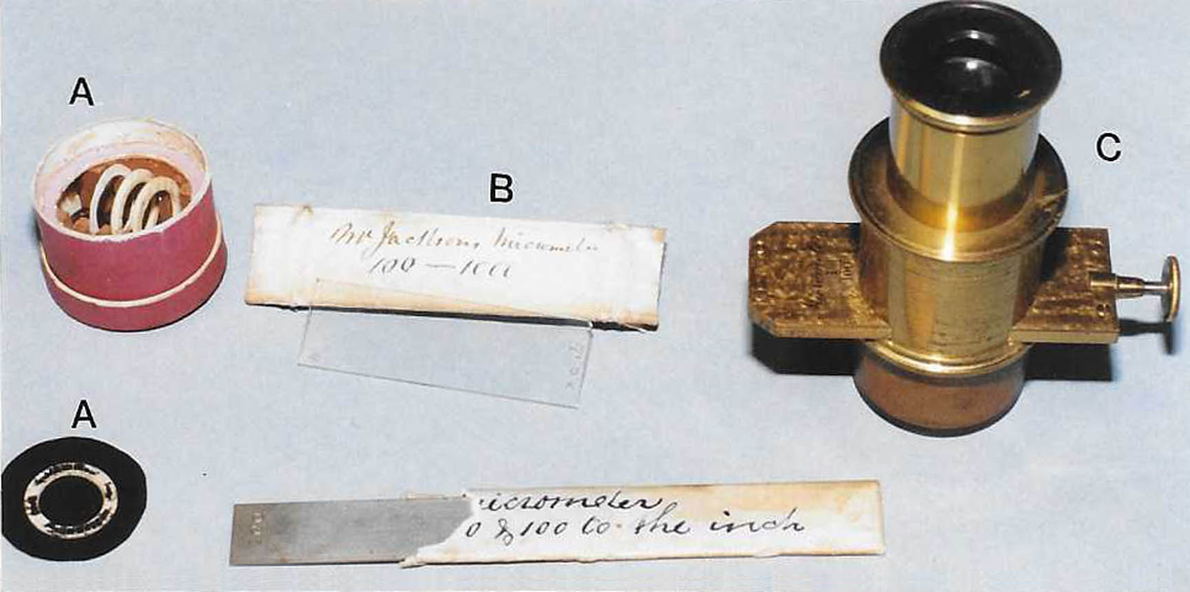 developed the slip-over Lieberkuhn reflector that could be put on or removed; these were supplied with early nonachromatic instruments such as the ‘Cuff Double Microscope’ (Fig. 9). Later slip-over Lieberkuhns were supplied for achromatic objectives (Fig. 10 C,D & E).